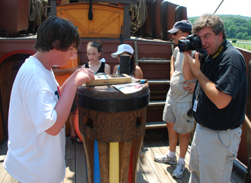 Captain Reynolds and the senior crew advisors tour the student projects as they work, offering advice as needed. Here the captain helps Alex take accurate readings with a quadrant to track the sun.