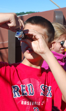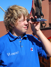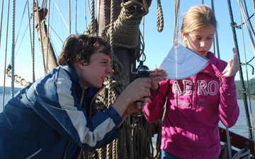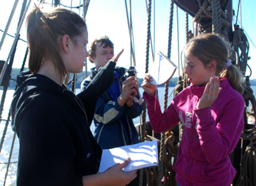 Procedure: Starting early in the morning while the ship remained stationary off Piermont Marsh, the celestial team used their instruments to track the course of the sun as it reached its zenith (highest point). At each reading, Kortnee aimed the quadrant at the sun (using its shadow to align her instrument rather than staring down its length directly at the sun). This determined the sun's elevation in degrees. At the same moment, Hansen used the directional compass to determine the sun's bearing, or azimuth. Alyssa and Lauren alternated between taking the quadrant reading or acting as official timekeeper.