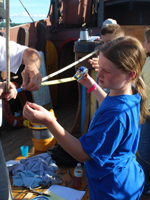 Procedure: While the ship remained at anchor off Piermont Marsh, the mechanical advantage team of Dakota, Gabrielle, Marije, and Rianne constructed a block-and-tackle simple machine in several configurations, using from one to five pulleys. They filled a bottle with water and placed it in a canvas bucket to fasten it to their rig, then marked the bottle so they could note when it had risen off the deck exactly two feet. The fixed weight and distance formed the constants in the experiment. With each pulley configuration, the students then lifted the weight and marked the line, measuring how much line had been pulled through the simple machine under each configuration in order to produce the constant.
