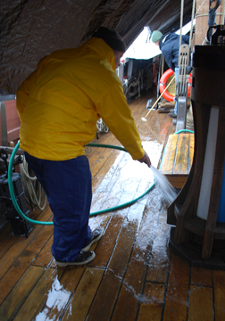 It's a wet, low-key morning today, as the crew busy themselves with general upkeep, including a deck wash.