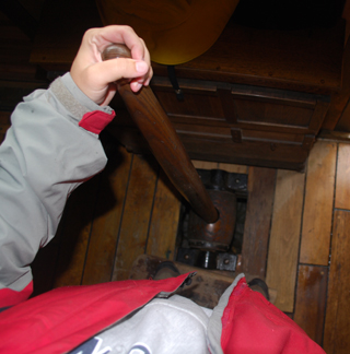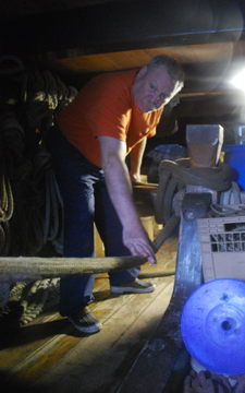 Meanwhile, belowdecks, Mr. Noonan remains in charge at the bits. He controls the rode, letting out 150 feet before making fast the line.