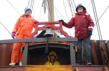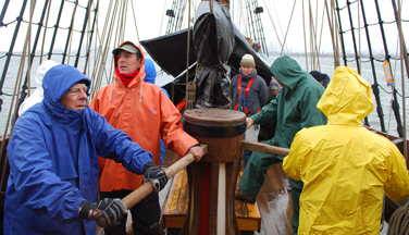 Fortunately for the sake of this log, we've color-coded our capstan crew. Otherwise it can be hard to identify the clusters of hooded figures who replace our happy crew on blustery days!