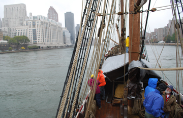 The East River is a scenic change of pace for us. Despite the rain, the crew hangs at the rail to take in sights such as the Brooklyn Bridge and the United Nations.