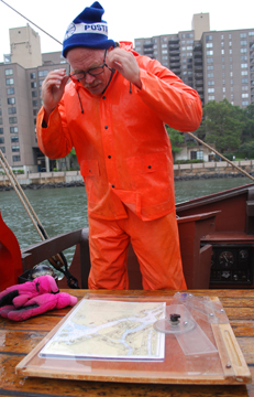 Checking our position, Captain Reynolds notes that we're racing along at nearly 9 knots. In fact, however, we're barely adding 3 knots to the East River's raging current; no wonder he opted against fighting the ebb tide last night!