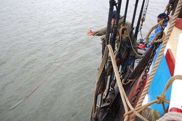 After observing the procedure yesterday, today it's Mr. Stevens who has the honored position of pulling the "fid" — the wooden pin that tethers the anchor to the block-and-tackle holding it aloft. When the order comes to "Let fall!" he does, and the anchor instantly vanishes into the briny depths.