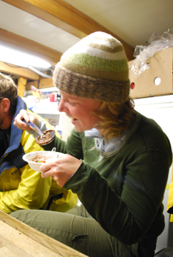 We top off dinner with chocolate banana pudding for desert, which the crew samples with similar restraint.