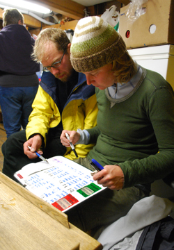 Back to work! Mr. Hensel and Ms. Waiboer — who are both effectively serving as bosuns on this voyage — prepare tonight's Anchor Watch roster and reconfigure the Duty Roster to account for our smaller crew.