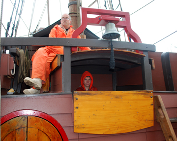 On the dock, we have Ms. Reilly positioned to tend our lines along with transit voyage crew members Carolyn Niehaus and Patrick Noonan., who will stay on hand to aid us during our dockside programs for the rest of the month.