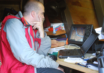 Captain Reynolds closely monitors our position from the Quarter deck throughout the morning.