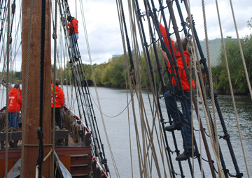 Ms. Waiboer ascends the fore mast to gauge the bridge's height. No worries; we have at least 20 feet of clearance.