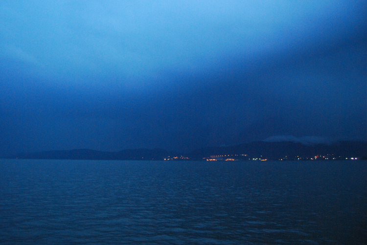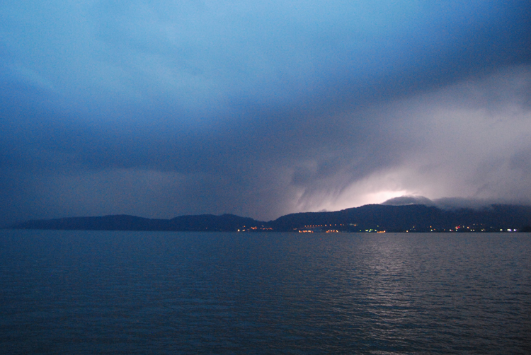 Entry Four, Part 4 of 6: 1916 Hours: A series of squalls blows over the Half Moon as the sun sets. Mouse over (or click on) the image above to see one of the lightning strikes we watched peppering the surrounding communities of Haverstraw and Verplanck.