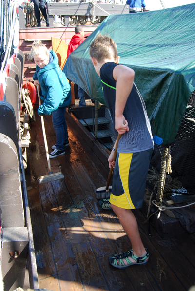 Entry One, Part 8 of 8: 1107 Hours: Once the anchor's up and secured on the channel, the Half Moon is underway. As the ship heads upriver, we call for a deck wash. Caitlin and Miskas put their backs into scrubbing the decks.