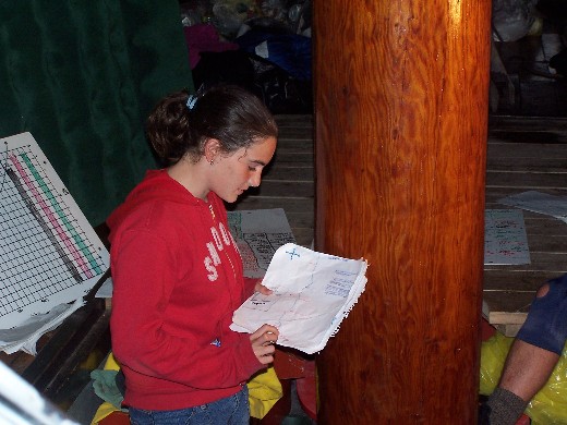 Ryan used a lead line to perform soundings at each of our anchor points, comparing their relative water