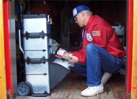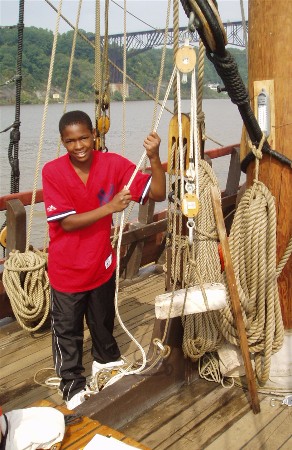 Above the ship, we use dozens of blocks (pulleys) in the rigging to handle the sails. The lateen sail alone, our simplest sail, uses more than twenty! Tevon (left) devoted his project to studying the principles of mechanical advantage. Here you can see the block & tackle system he set up to lift a 60-lb. lead ingot (borrowed from our ballast). Later he added more blocks, measuring how each addition increased the block & tackle's mechanical advantage. |