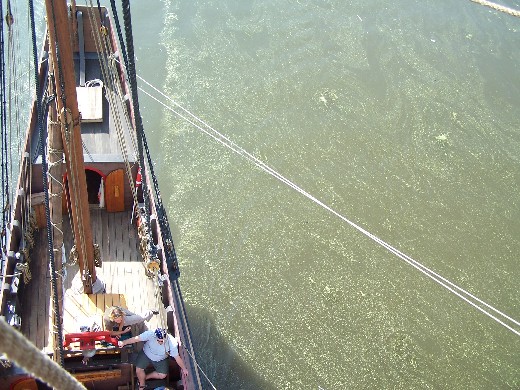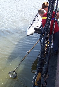 The Hudson's current can notably affect the Half Moon's navigation; for example, if we sail with the current, it can speed us along, or it can slow us down when sailing against it. It's also important for local wildlife, since some species thrive in slow currents, while others prefer more rapid waters. The Hudson is a tidal river from its mouth in New York Harbor all the way up to Cohoes, so the speed of its current can vary considerably -- even reverse itself -- as the tides ebb and flow. The student crew uses wood chips (being collected by Mr. Swartout, above) to measure current speed. Students examining current speed as part of their projects, such as Charles and Nicole, would then toss a (biodegradable) chip into the river, timing it as the current carried it between two fixed points (such as the length of the weatherdeck) to calculate its speed.