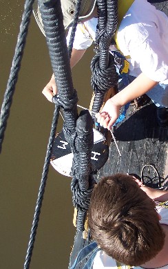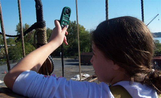 As one might well expect, wind speed is an important consideration for a sailing ship like the Half Moon. Charles, Kristin, and Samantha focused on wind speed in their projects, using hand-held anemometers (as Samantha is doing, above) to take measurements, recording peak and average wind speeds throughout the day. The students also compared wind speeds on the weatherdeck with those recorded at the same time in the tops. They found that the wind was consistently stronger higher in the air, and proposed several theories to explain their findings. Checking wind direction is quite a bit easier -- just look up at the flags!