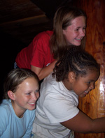 2000: With their academic projects behind them, the pressure is off our student crew. They're more than happy to help in the galley. Here, you can see Ericka and Riki enjoying themselves as they clean dishes. |