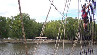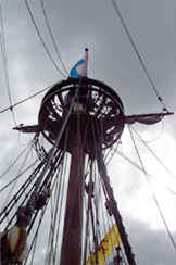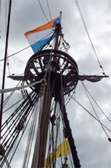 1130: Before we reach Albany, we must lower the top sections of our foremast and mainmast; otherwise the Half Moon is too tall to clear the Dunn Memorial Bridge. Mr. Morel is in charge of this operation. While we are underway, he prepares to lower the fore topmast. The adult crew handles this task, letting the students concentrate on their academic work. |