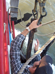 Once the anchor is back on the fore channel, Mr. Dawson secures it and refits the wooden "carrot" -- the quick-release pin which fastens the anchor to its tackle. With that, the anchor will be ready to deploy again whenever we want.