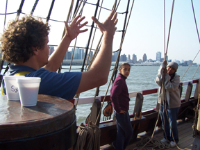 With a maximum speed of eight knots (and our current speed closer to a casual six), it takes all morning for the Half Moon to pass the long shorelines ofYonkers and Manhattan. Our goal is to reach Governor's Island by 1100 hours -- at which time the Hudson River will also be host to a cigarette boat race. For us, this would be the equivalent of getting caught in rush hour traffic.