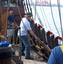 Over on the starboard side, Jon works the main course tack -- a line that pulls the corner of the sail forward -- while Mr. Beiter works the fore course sheet -- which pulls the corner of that sail toward the aft (back) of the ship.