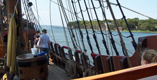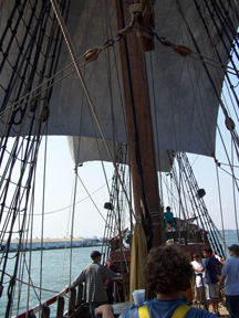 Fortunately, we have a steady, northerly wind at our backs, so this is a prime sailing opportunity. Mr. Terry climbs up the rigging to unfurl the sails.
