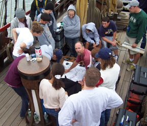 Before lights out, we gather around on the orlop deck for a reading of Juet's journal -- the very same journal entries you can read at the end of these daily logs. After reading Juet's journal, it's time for the students to update their own personal logs. Then comes lights out at 2000 hours, and the end of an active day.