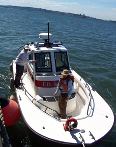 Earlier today we drew the attention of the Fireboat from Staten Island. Firefighters Jim Kinncary and Bob Labas were on their way to Ground Zero, and stopped by to say hello. We needed to mail a parcel for ship’s business, and they were kind enough to help us. They've now returned to the Half Moon, mission achieved.