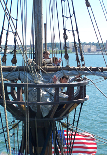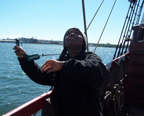 Meanwhile, Jon is helping out by using the lead line to take a sounding -- a method for measuring water depth that Hudson's crew performed exactly the same way.