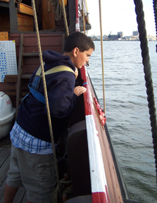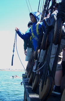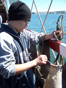Up on the fore deck, Mr. Weisse's knot students have become so skilled that they can now tie a bowline with their eyes closed.