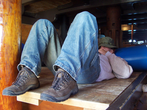 As the afternoon winds down, most of the students have completed the research for their projects. (A few need to take a few more readings tomorrow morning, as we move upriver, to gather samples from different locations.) While waiting for dinner, the students relax and practice their knot tying.