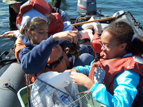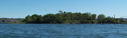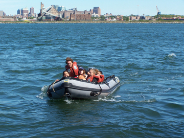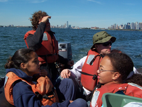 Although New York Harbor is obviously a highly urban and industrial area, it's still home to a wide variety of wildlife. Near our anchorage, we head toward this green stretch of the Brooklyn waterline. Depending on the time of day (specifically, the state of the tides), students may be able to step onto dry land as they look around.