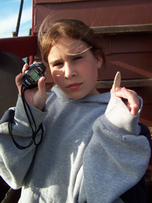 Research continues apace. Tori is about to use this stopwatch and a biodegradable wooden "biscuit" to measure the current speed.