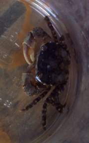 ...including three live crabs, such as this fellow here (this photo is approximately life size). Dr. Jacobs has the students draw the crabs, paying close attention to their anatomy. Later, using some of the field guides in our research library, the students attempt to identify the crabs' species.