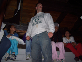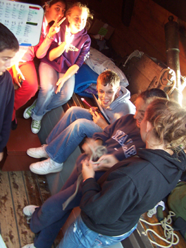 As the sun sets and the air grows cooler, the students retreat to the orlop deck. As they relax, they break into an impromptu singalong.