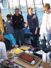 Most of the students retreat below decks with their meal to rest out of the sun.