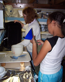 Mrs. Barton and Mrs. Lawler serve a warming breakfast of oatmeal, cereal, and breads. Don't judge it by Kaeli's expression!