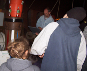 Zora's experiment requires that the wind speed be measured at the same time both on deck and in the top. This gives other students an opportunity to spend time aloft. Here, Mr. Terry has accompanied Rebecca V. and Tori into the rig so they can measure the wind speed...