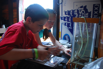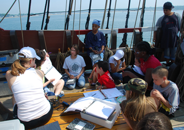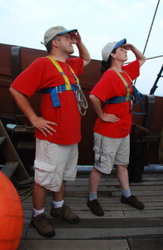 Although the students have not yet officially begun thei research for their presentations, we have already started taking regular readings of the air and water temperatures for the ship's log. As Tahari enters the latest data, Alex -- still tethered to his duty as part of the main mast team -- looks on with interest.