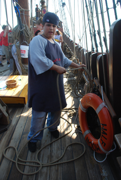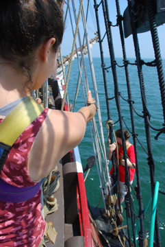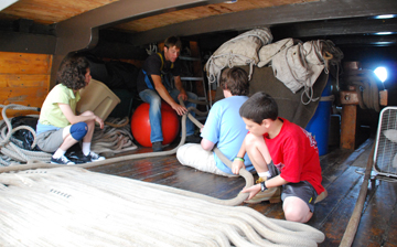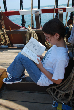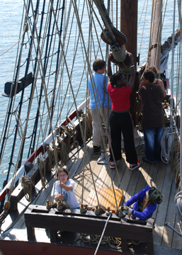 The morning is warming up, so for now most of the crew is relaxing below decks. Carolann, however, has found a shady spot to sit down and start learning her knots.