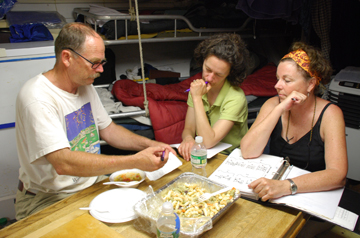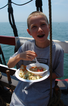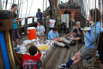 Dinner is served on the weatherdeck. Along with Carolann's cornbread, we're also having chile -- a nefarious meal in the lore of the Half Moon's old salts. Crew superstition holds that serving chile on board summons storms and bad luck (but it turns out that the curse seems to be broken).