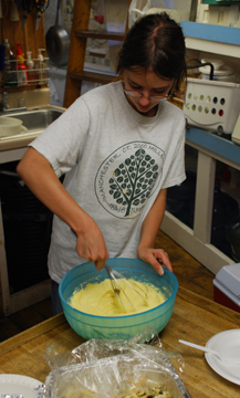 After the briefing, the students return to their regular duty assignments. Down in the galley, Jamie puts the finishing touches on grilled cheese sandwiches for the crew.
