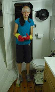 Work continues below decks. On galley detail, Carolann is making cornbread for dinner, while Nora -- returning to her maintenance duties -- hustles down from studying the local marine fauna to cleaning a marine head.