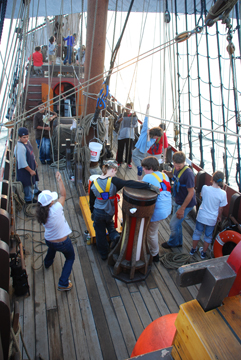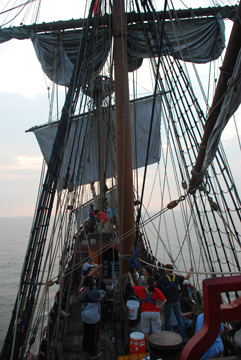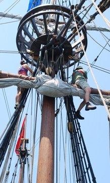 While most of the crew remains on deck, two crew members climb aloft to work in the tops, their job being to help manage the top sails.