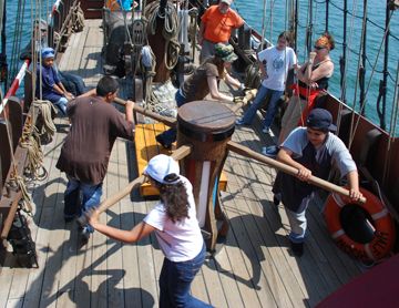 On the weather deck, the capstan team starts walking their beat, hauling in the anchor rode one step at a time. Additional crew members stand by to add their strength as needed.