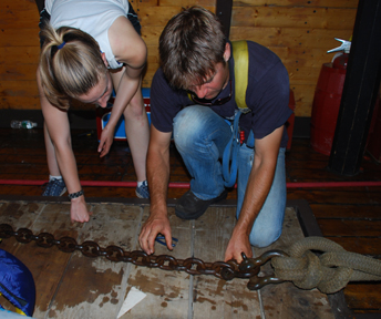 After the anchor is weighed and secured to the fore channel, Mr. Schuijer detaches the shackle connecting the chain to the rode. The remaining rode is then freed from the capstan and faked. Once the chain is reattached near the hawsehole, the anchor is ready to be deployed again at a moment's notice.