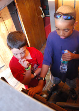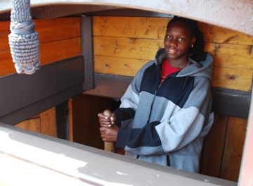Jamie and Tahari man the helm as a team. This may be a first -- two helmsmen on duty at the same time and they still have plenty of room to walk around in the helm hutch.