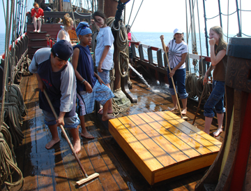 The heat and humidity are starting to wilt our crew, so we call for a deck wash. Soaking the ship's planks in salt water is good for the Half Moon, making it more watertight, and it comes as a relief to sweaty sailors as well.
