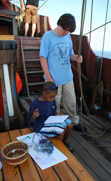 Jamie and Nora immediately consult our reference library and measure the crabs to identify their species. Other students will take the same opportunity as the voyage continues.