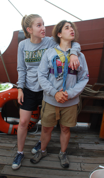 Now that we're at anchor, the Half Moon once again quickly becomes the center of attention for every passing boat within sight. Carolann, Danielle, and Nora practice their "overenthusiastic waves" to greet them.